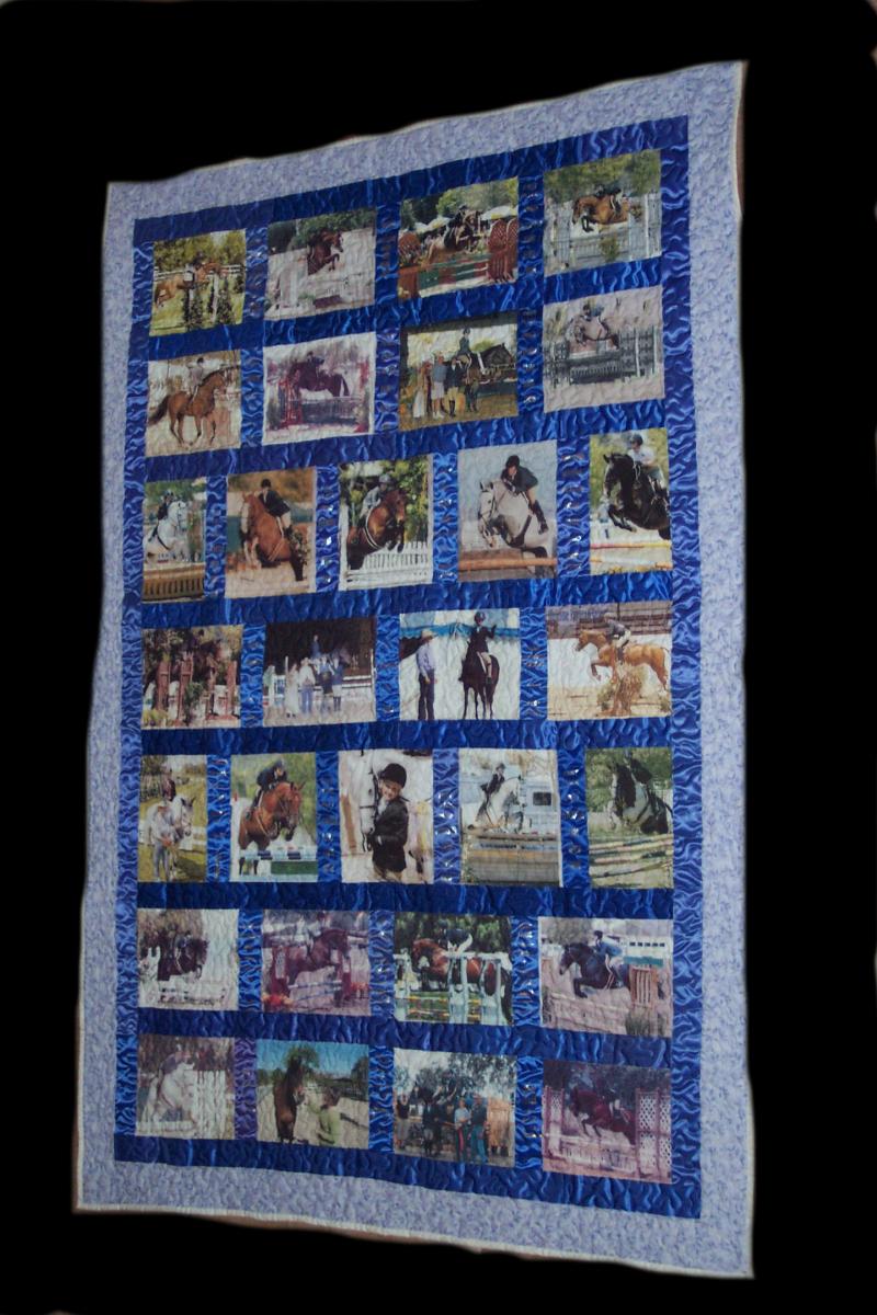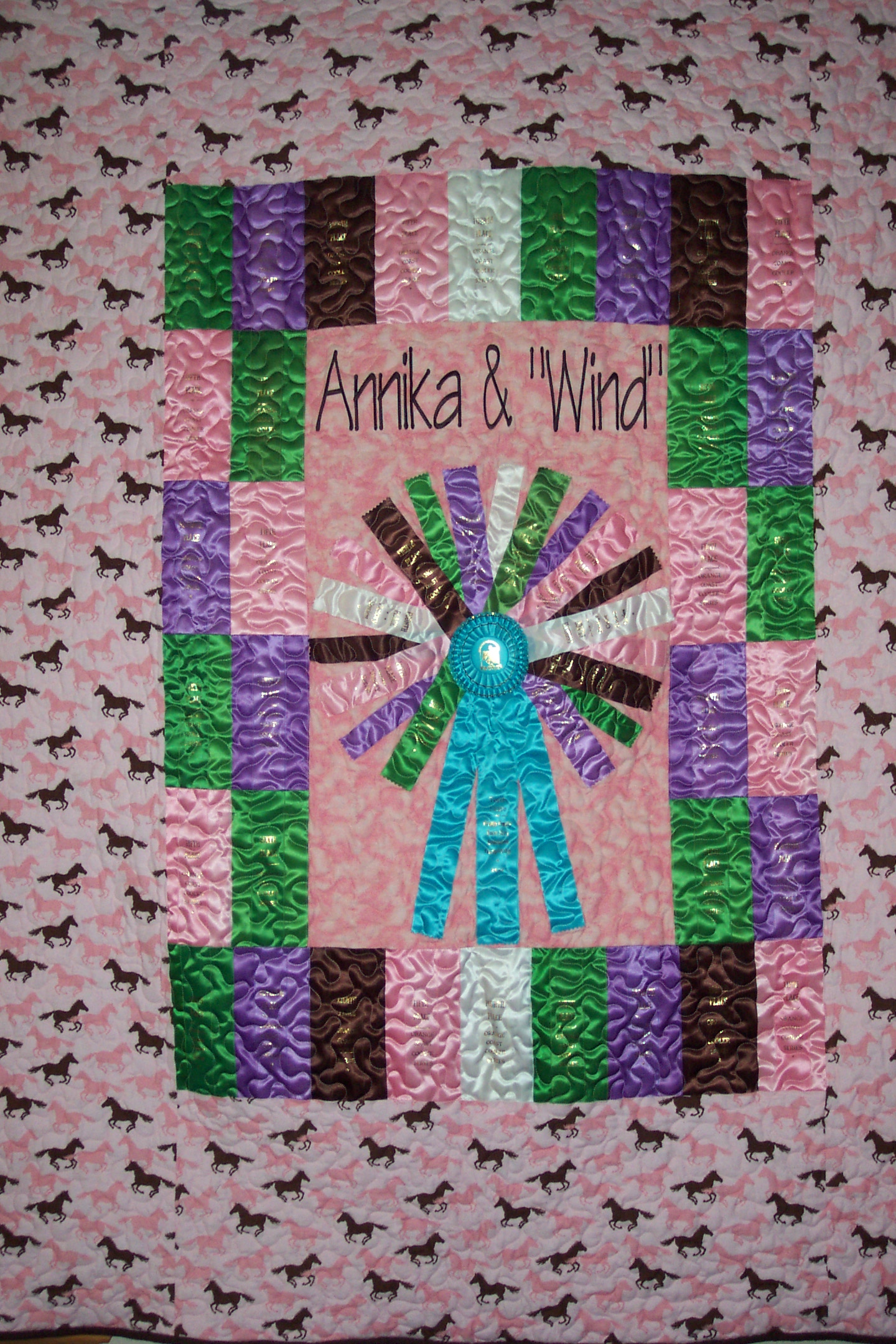 These silk sash ribbons are awarded at shows in New Zealand and Jade's mom had this queen size quilt made for Xmas 2011! I added photos and see pillow page for close ups on pillows of her three terrific horses.