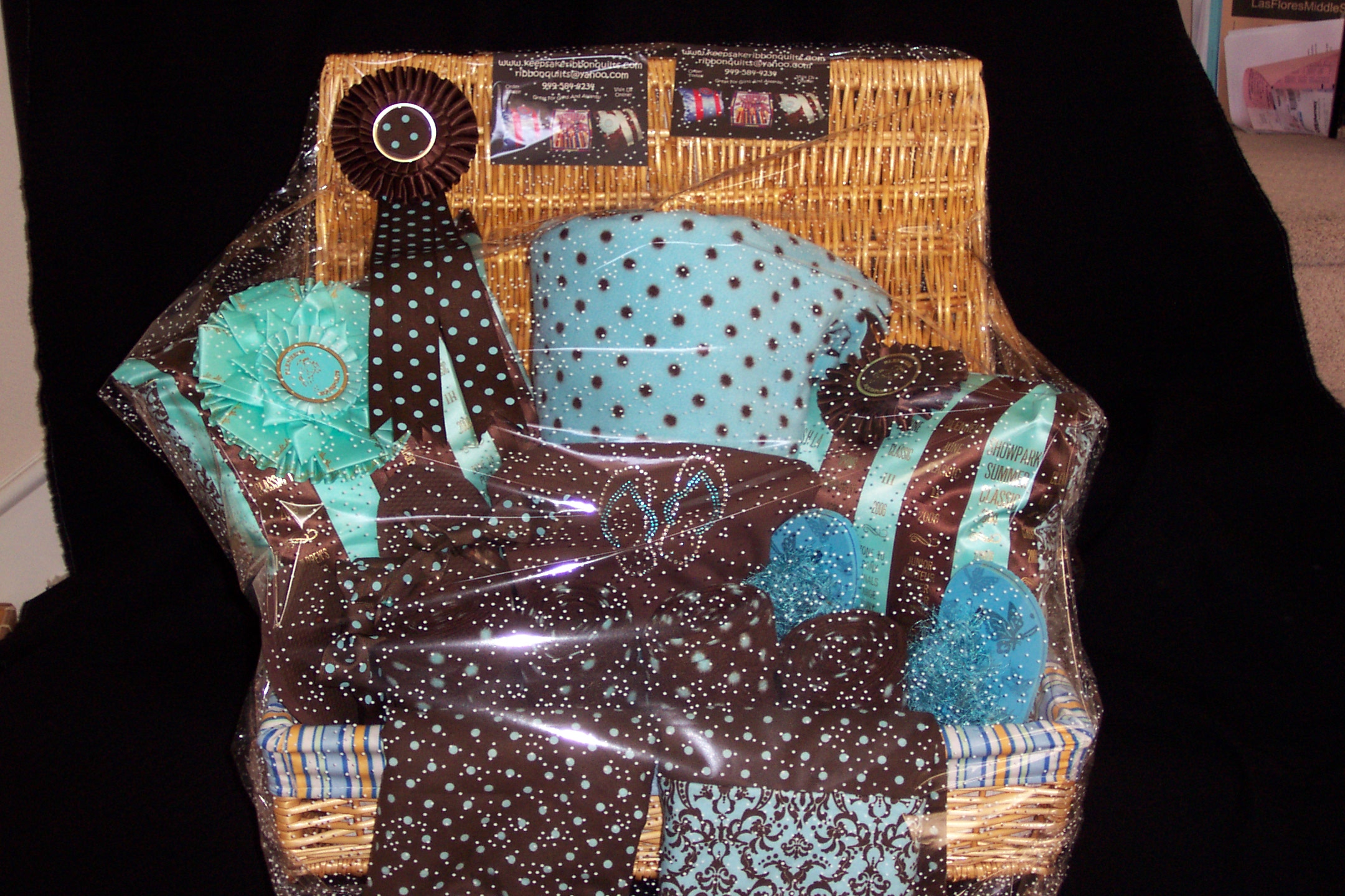 This specialty basket was used as an auction item for the Flintridge Riding Club's Children's Show. Two pillows, throw, two pillowcases, two pairs of flipflops, 4 polo wraps and a tank top. Let us custom make a basket for your special occasion. $200