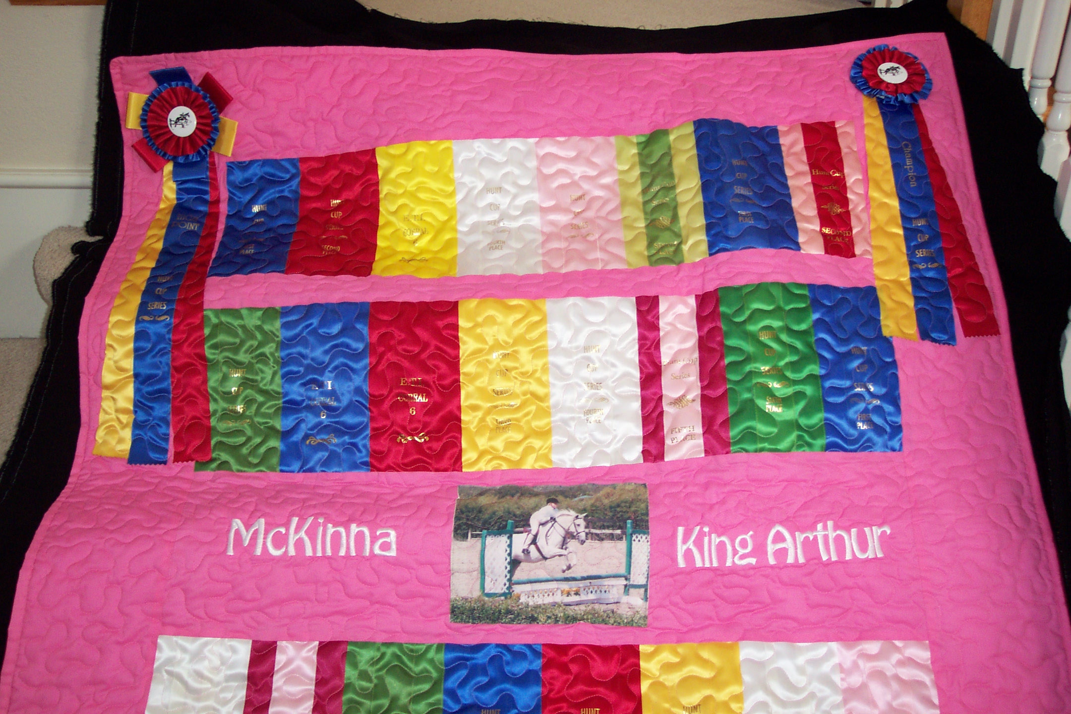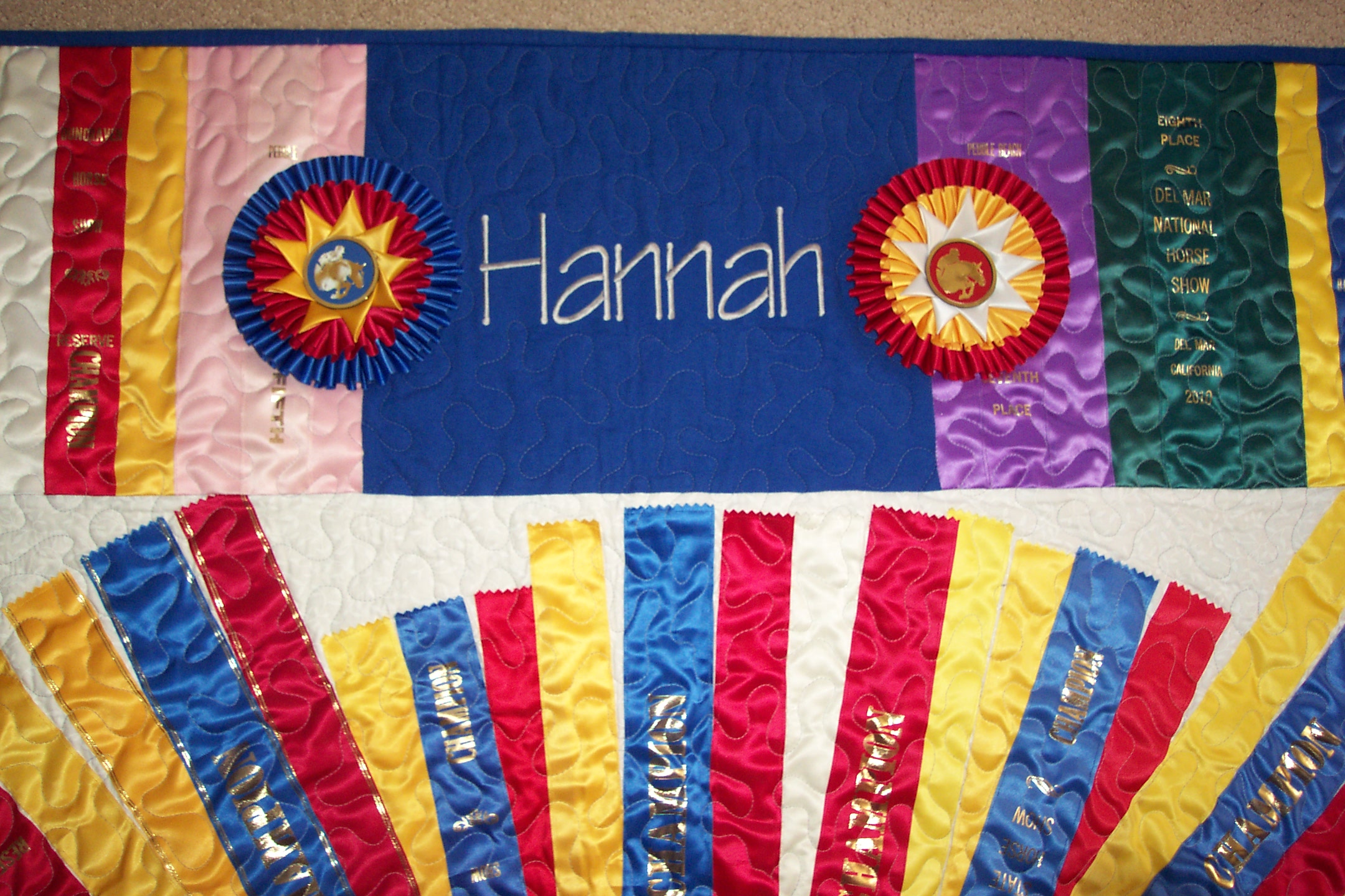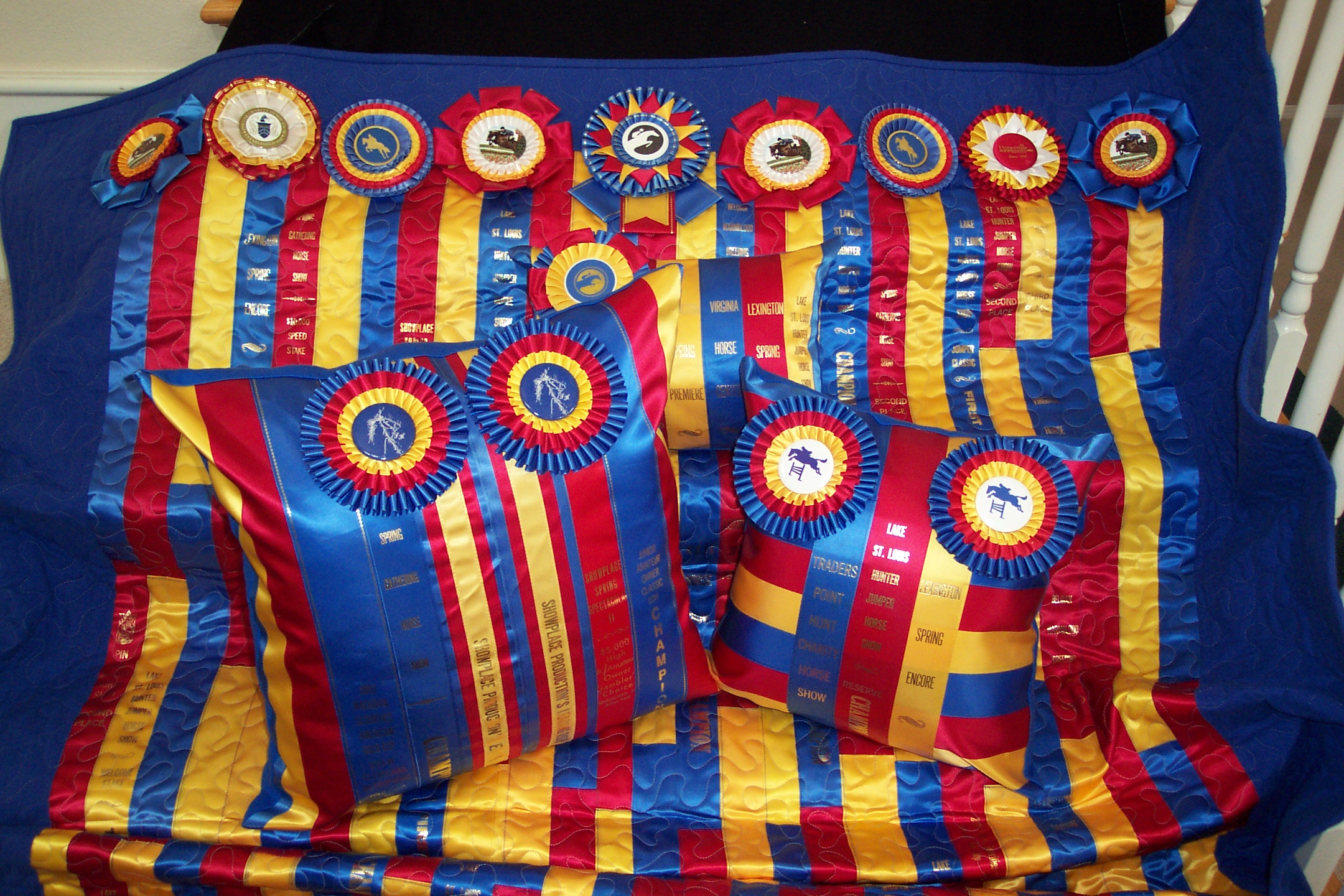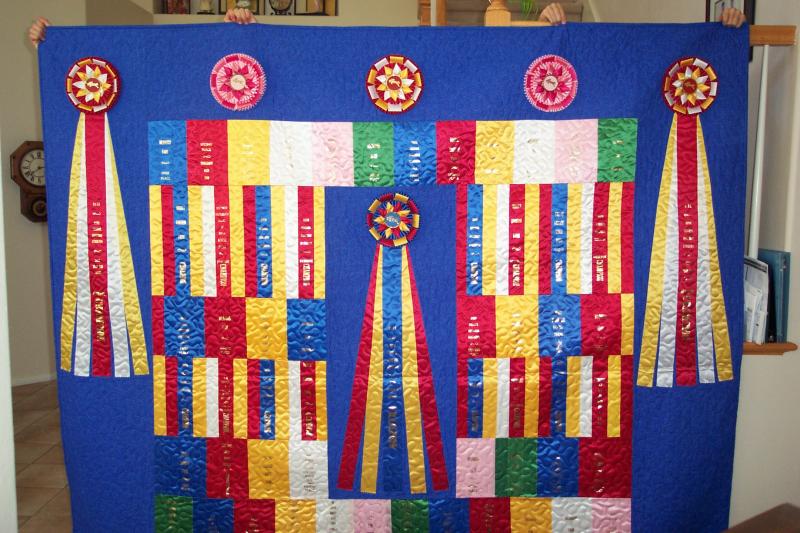 Alison had so many beautiful champion ribbons that we made a twin size quilt and three different size pillows to show them off!