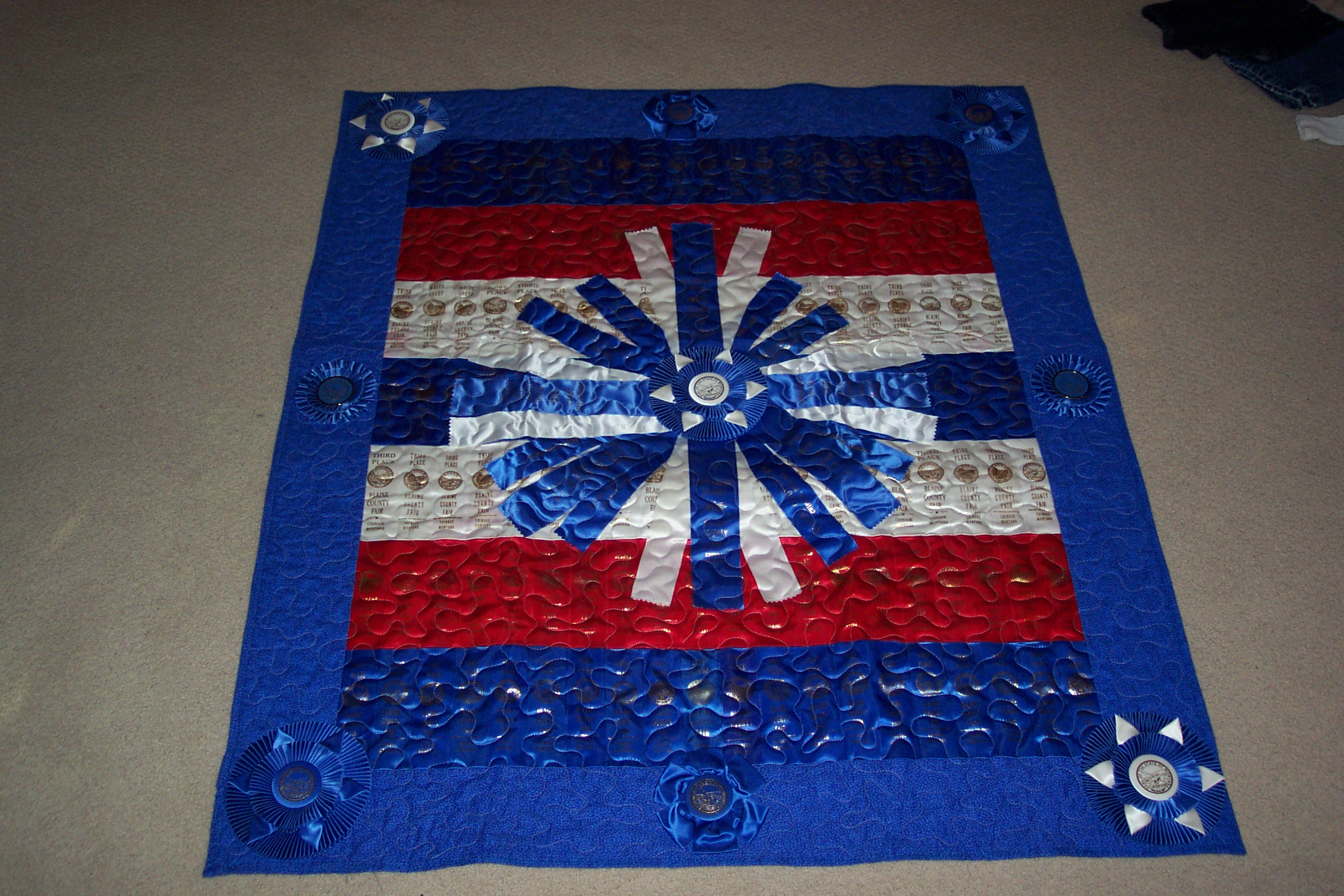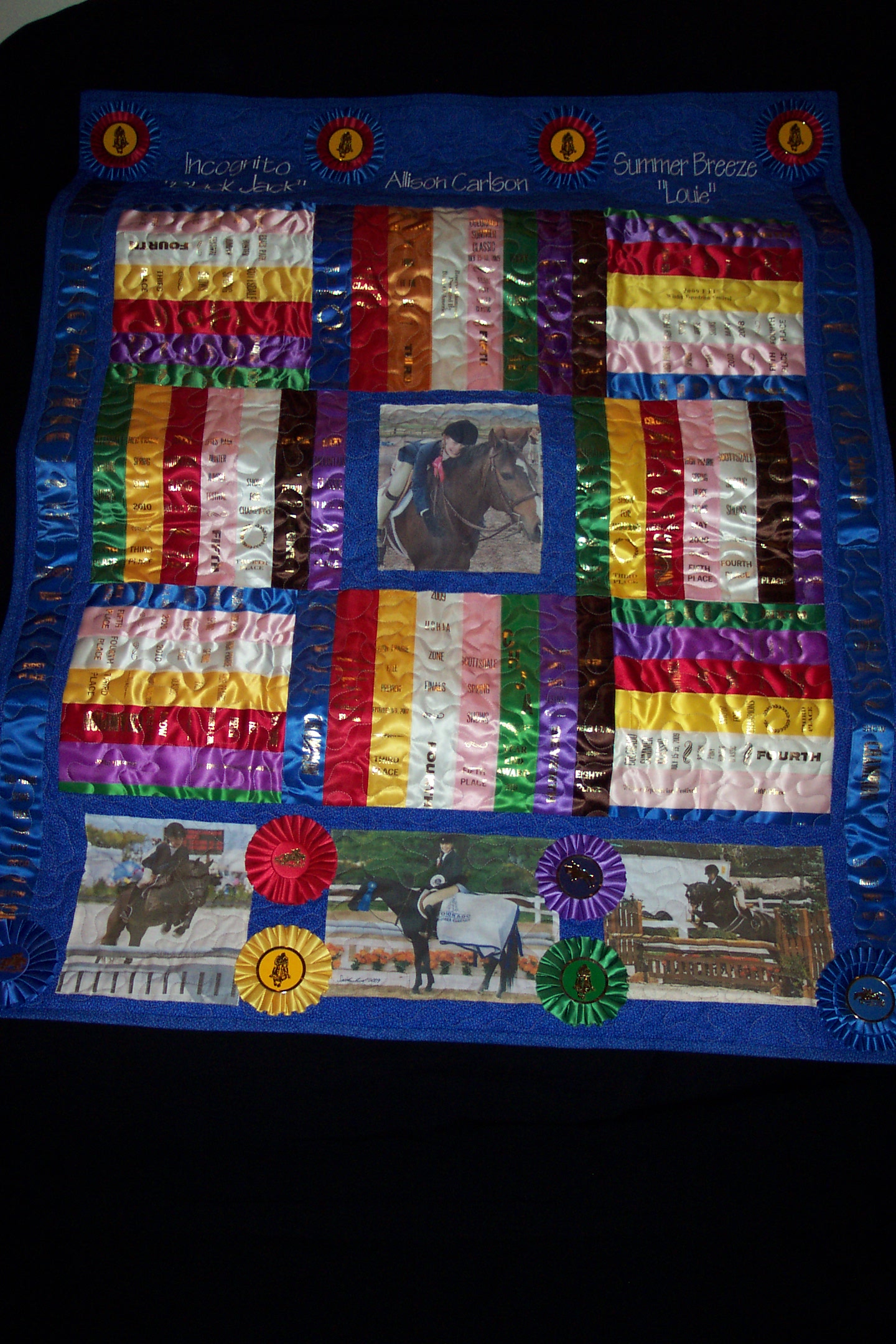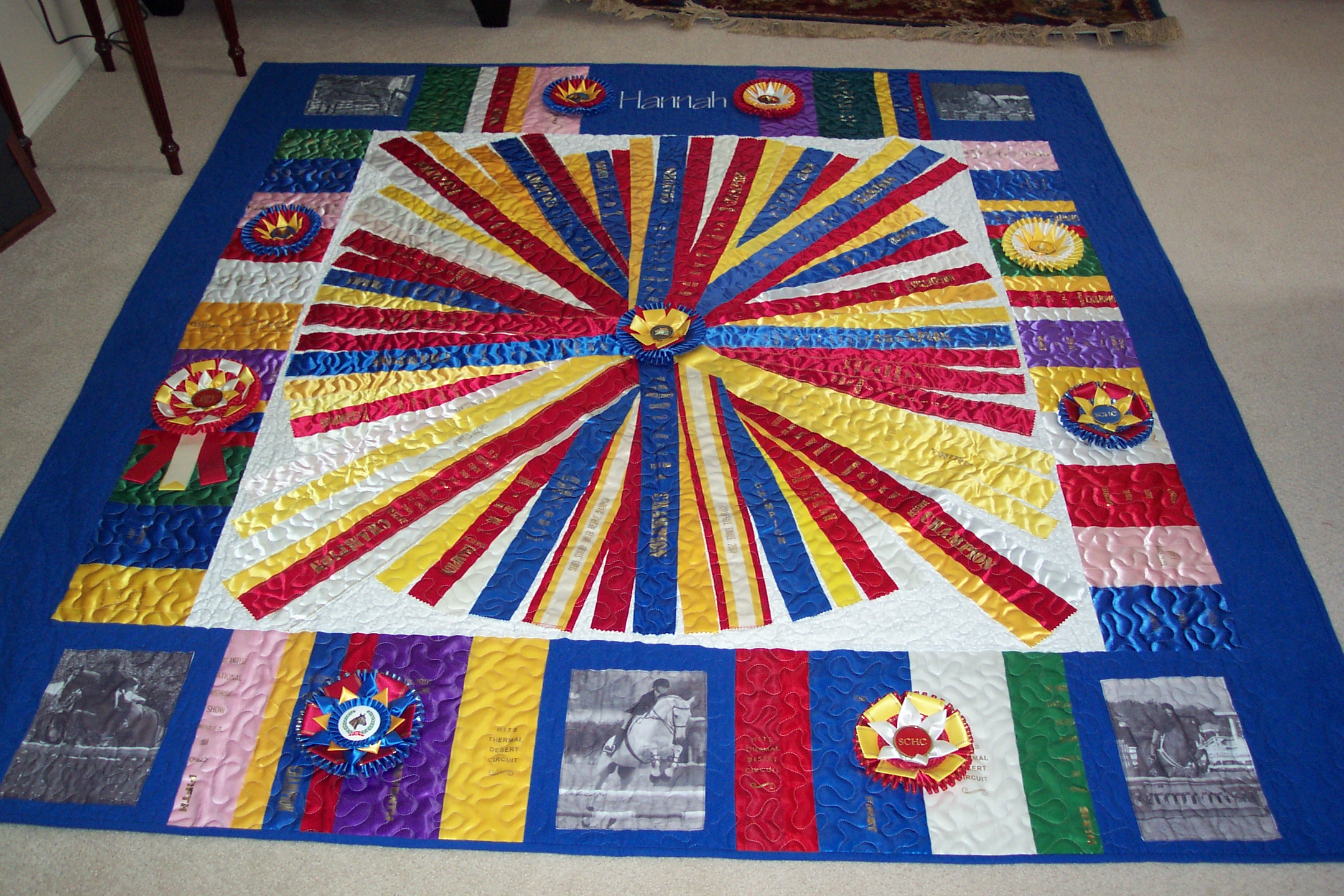 Alison had so many beautiful champion ribbons that we made a twin size quilt and three different size pillows to show them off!