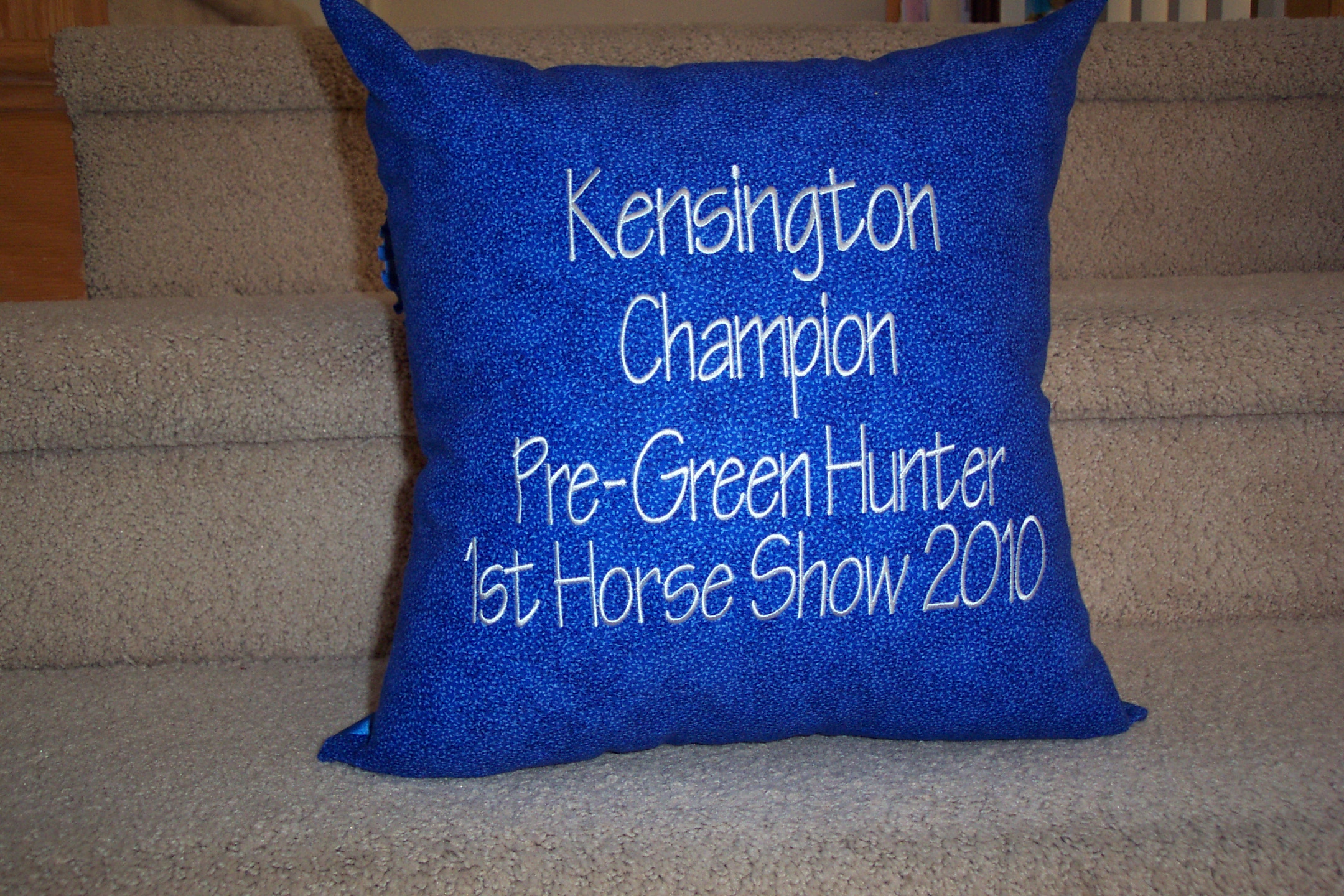Colleen's horse won everything including champion in his first show ever so we embroidered that on the back of her pillow!
